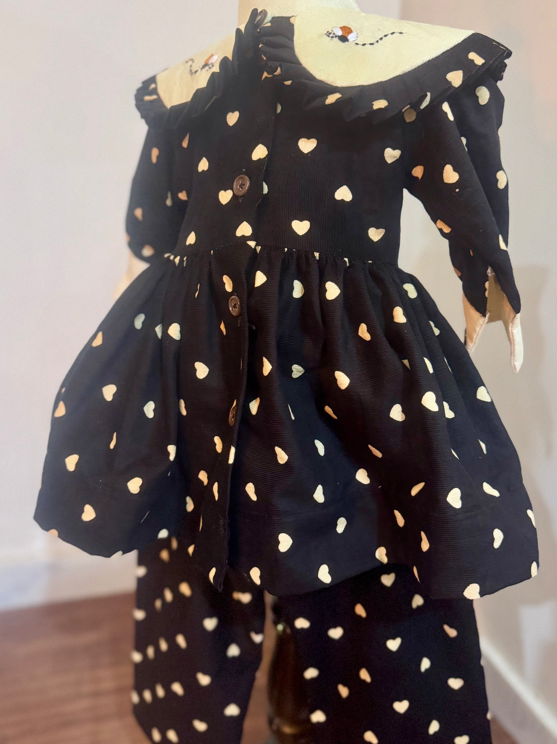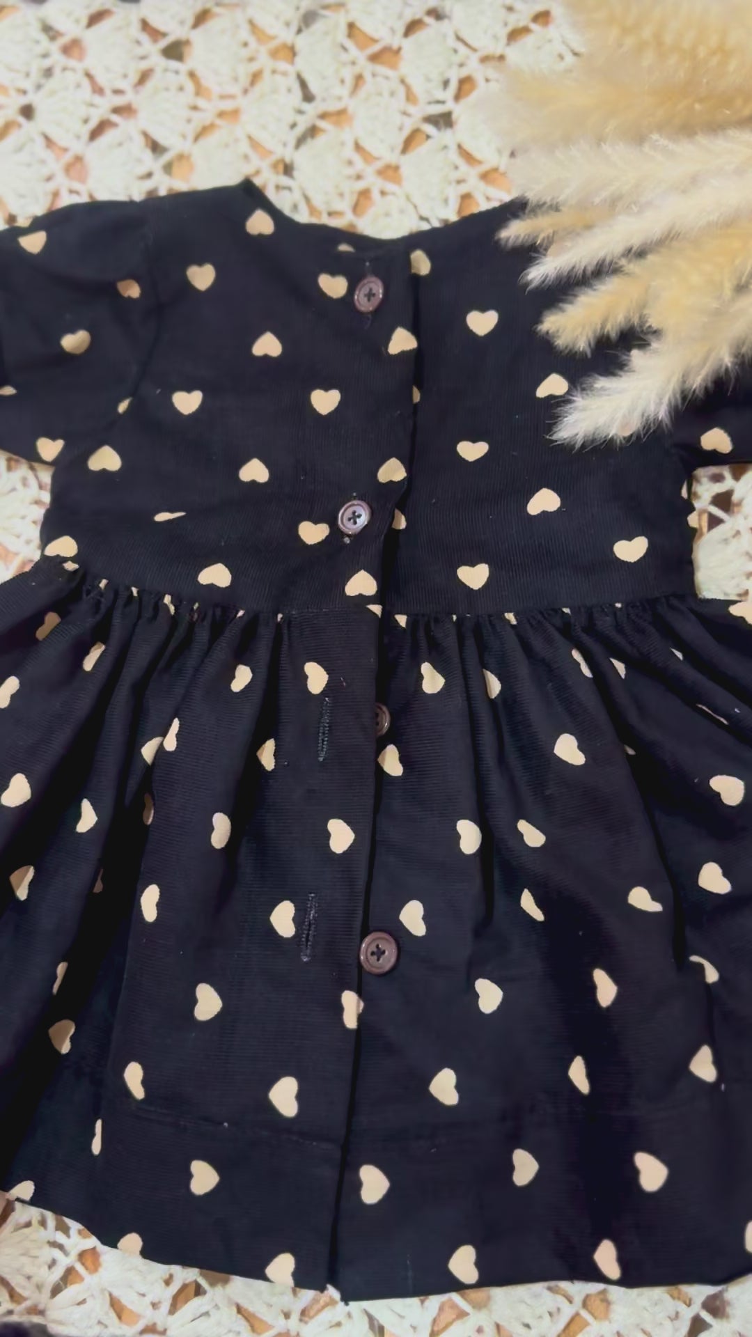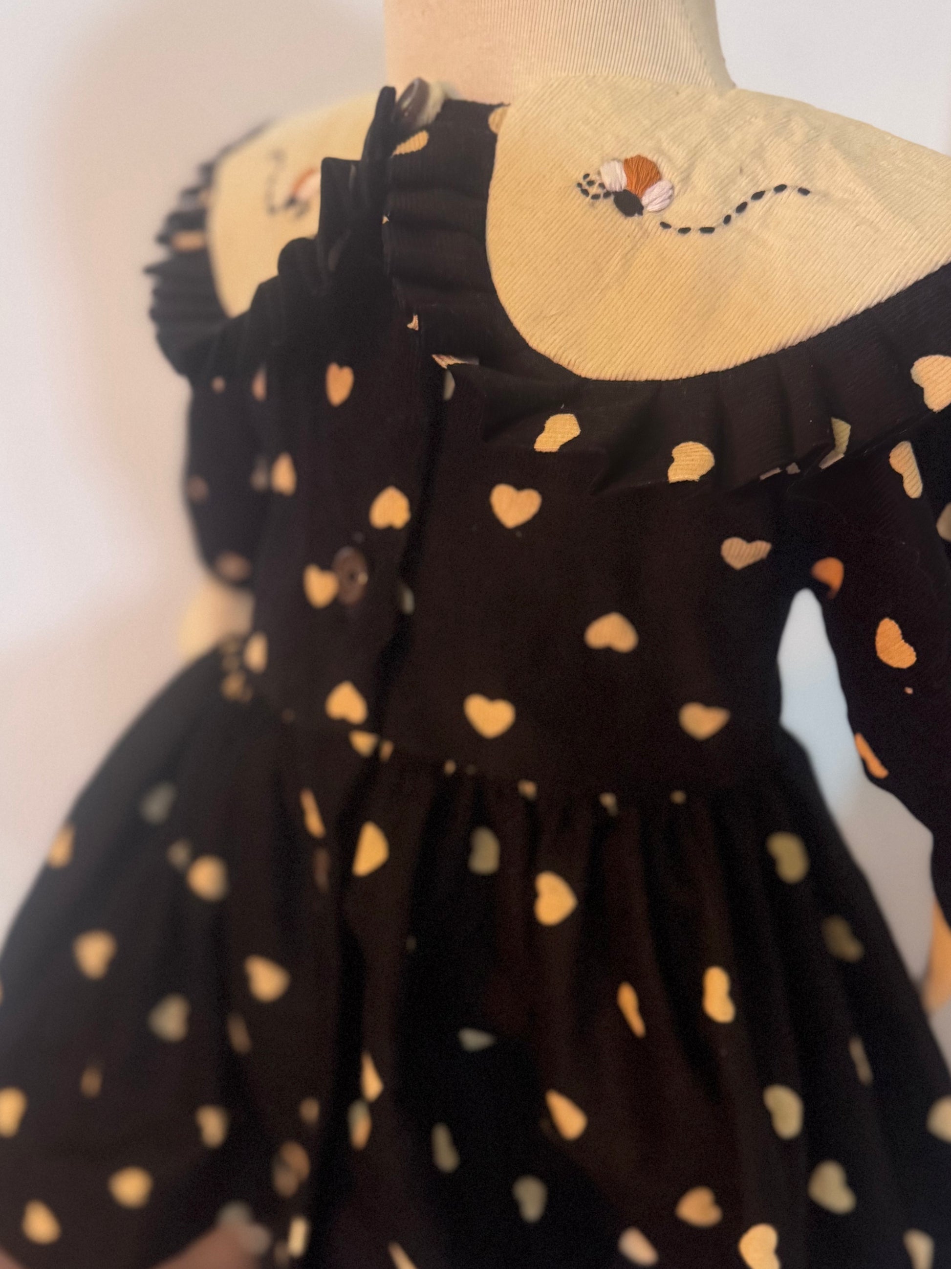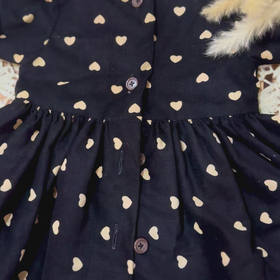 A story of sweetness and play, Heartstring Melody is where little moments hum with warmth and wonder. Crafted in soft black corduroy scattered with tiny cream hearts, this dress carries a quiet kind of joy, the kind that lives in laughter, sunlight, and handmade care.